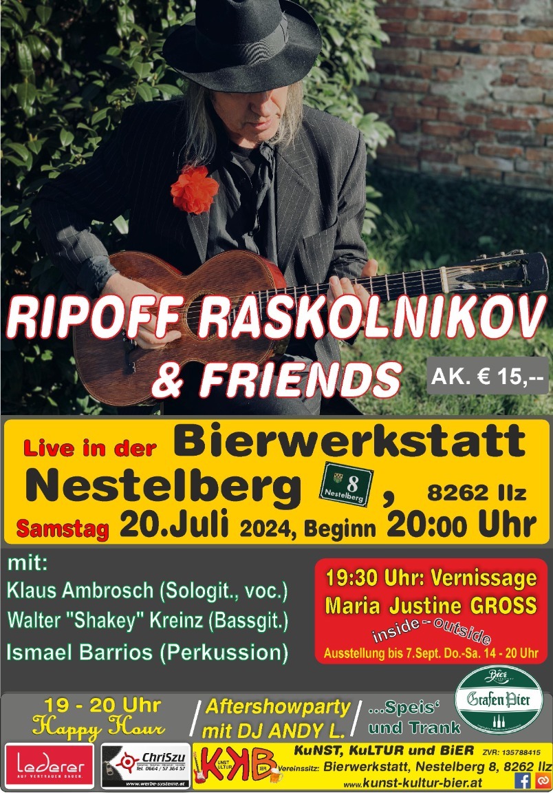 Bierwerkstatt Nestelberg Nestelberg 8, Ilz +1 weitereRipoff Raskolnikov & friends Der in Graz lebende Bluesgitarrist und Singer/Songwriter Ripoff Raskolnikov gehört zu den authentischsten Vertretern seines Genres. Seine Bewunderung für die Blues-Größen der ersten Stunde wie Blind Willie McTell, Skip James, Robert Johnson oder John Lee Hooker findet ihren Ausdruck nicht in Imitation. Vielmehr verbindet ihn mit ihnen die Konsequenz, mit der […]